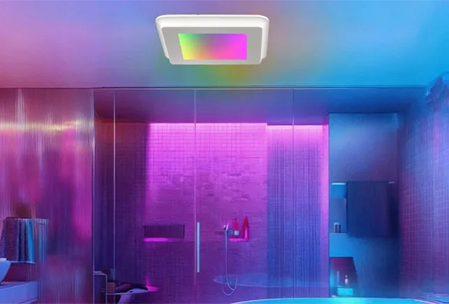 Integrated humidity & motion sensors, Bluetooth speaker, decorative lighting, heater, RGB ambient light, dimmable LED, 3CCT & nightlight – fully featured.